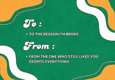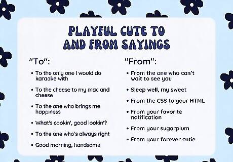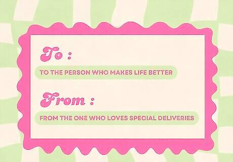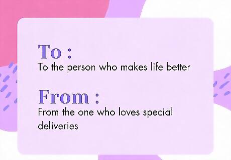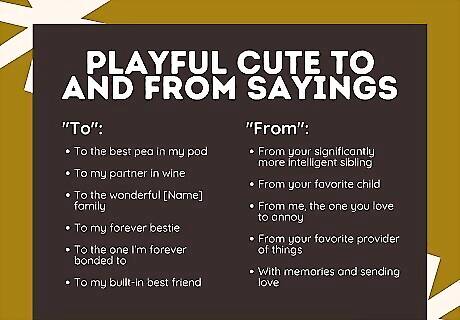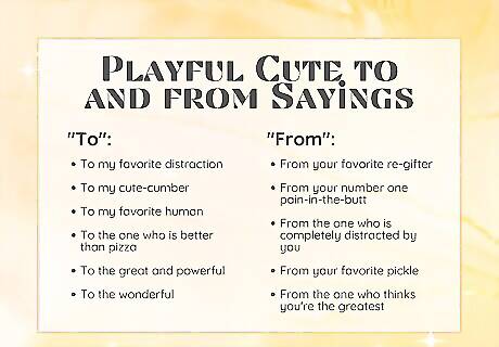 Use fun-loving salutations and closings that’ll entertain them. Use a play-on-words to impress the girl or guy you’re writing to. Examples include “to the one who is better than pizza (and that's saying a lot)" and “from your permanently weird person.” Sayings like the ones ahead work for friends, your favorite coworkers, or your S.O. “To”: To someone who never shows up empty-handed To my favorite distraction To my cute-cumber To my favorite human To the one who is better than pizza (and that's saying a lot) To the great and powerful [Name] To the wonderful [Name] To my favorite [Name] Dear old pal [Name] To the most charming [Name] “From”: From your favorite re-gifter From your number one pain-in-the-butt From the one who is completely distracted by you From your favorite pickle From the one who thinks you're the greatest From the one who loves you more than pizza From your permanently weird person From your most important tag From your one and only [Name] From your favorite partner-in-training