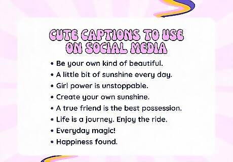 Share delightful sayings as captions on social media posts. You can place these cute captions for Instagram alongside a photo or as part of a post you write yourself. They’re all super positive, cheerful, and promote good vibes. From “everyday magic” to “life is better when you’re smiling,” you’ll help make someone else’s day. Be your own kind of beautiful. Life is short; make every hair flip count. A little bit of sunshine every day. You are never fully dressed without a smile. Girl power is unstoppable. Create your own sunshine. Always be yourself, unless you can be a unicorn. Then, be a unicorn. A true friend is the best possession. Friends are the family we choose for ourselves. Good friends are like stars; you don’t always see them, but you know they’re there. Friends are the glue that keeps us all together. Life is a journey. Enjoy the ride. Life is a gift. Be thankful for every moment. Everyday magic! Happiness found. Life is better when you're smiling. More rain, more flowers! Optimism is my superpower. Happiness is contagious. Today's a good day to have a good day.