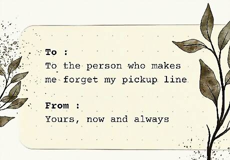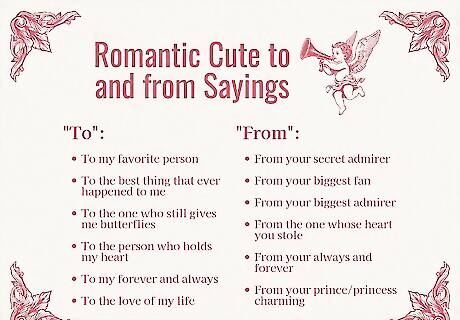 Flaunt your lovey-dovey side with romantic words and phrases. When addressing your love note, use a compliment to impress the person you love most. They may be “the best thing that ever happened to me,” or simply “the love of my life.” When looking for romantic things to say to your girlfriend or boyfriend in your closing, you can refer to yourself as their “biggest fan” or their “always and forever.” "To": To my favorite person To the best thing that ever happened to me To the one who still gives me butterflies To the person who holds my heart To my forever and always To the one who makes every day feel like a fairy tale To the love of my life To the reason I smile a little more, laugh a little harder, and cry a little less To the one who makes ordinary moments feel extraordinary To my beautiful dream come true Just for you, beautiful "From": From your secret admirer (who isn’t so secret anymore) From your biggest fan From your biggest admirer From the one whose heart you stole From your always and forever From your prince/princess charming From your forever grateful partner From the one who's so lucky you're real With love From someone who adores you From your lifelong partner From me, who loves you best