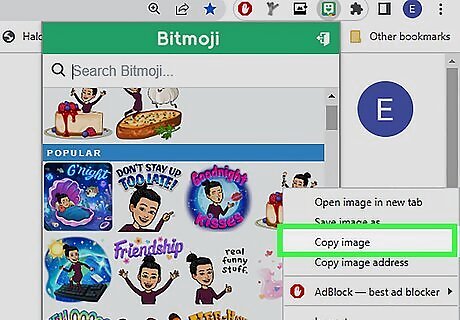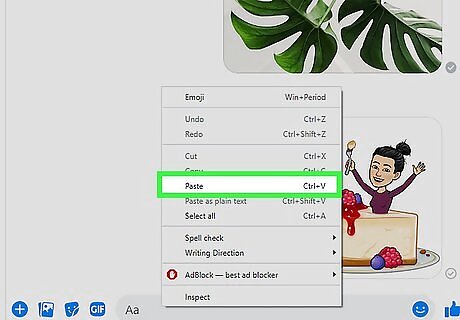 Paste the Bitmoji into site that supports images. Almost all social sites and apps, such as Facebook, Gmail, Twitter, and Hangouts allow you to paste an image directly into a chat or post. Right-click (or Control+click) the place you want to insert your Bitmoji, then select Paste. You can also paste Bitmoji into other apps on your computer, such as Microsoft Word or Adobe Photoshop.