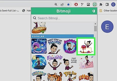 Get the Bitmoji for Chrome extension. If you see the Bitmoji button (a green icon with a white winking chat bubble) at the top-right corner of Chrome, you already have the extension and can skip this step. Otherwise: Go to https://www.bitmoji.com. Scroll down and click Get it on Google Chrome. It’s a black button at the bottom of the page. Click Add Extension. When it’s installed, you’ll see the sign-in screen. Enter your Bitmoji account information and click Log In, or select Log in with Snapchat if your account is linked with Snapchat. You’ll have to sign in to Snapchat if you haven’t already.