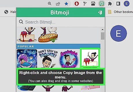 Find the Bitmoji you want to copy. To find it, click one of the categories listed (e.g. “luv ya,” “birthdays,” “you rock”), or type a keyword into the “Search Bitmojis” box.