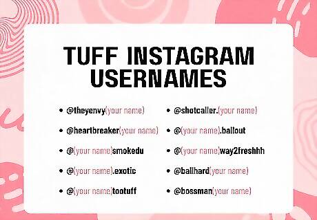 Choose a username that helps you stand out from other people. When picking a username on Instagram, you’ll want it to be cool enough to be tuff while also making sure it stands out from what everyone else has to say. So, try something like: @theyenvy(your name) @heartbreaker(your name) @(your name)smokedu @(your name).exotic @(your name)tootuff @shotcaller.(your name) @(your name).ballout @(your name)way2freshhh @ballhard(your name) @bossman(your name)