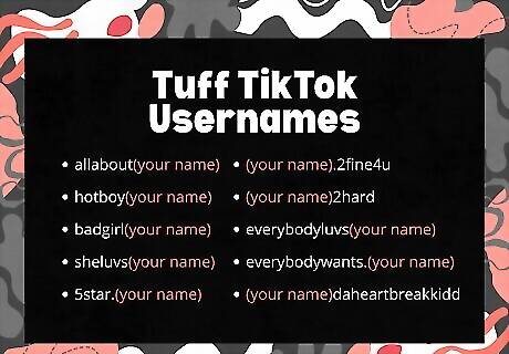 Pick an exciting TikTok username that shows how cool you are. TikTok usernames offer lots of flexibility when it comes to being tuff. TikTok’s username options tend to be longer than those on other social media platforms like Snapchat or X (formerly Twitter), giving you plenty of options to choose from when you’re trying to pick something tuff. These options include: allabout(your name) hotboy(your name) badgirl(your name) sheluvs(your name) 5star.(your name) (your name).2fine4u (your name)2hard everybodyluvs(your name) everybodywants.(your name) (your name)daheartbreakkidd