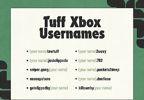 Pick a game-focused username to be tuff on Xbox. When you’re on the game, the tuffest usernames are typically the ones that are based on different games, like Call of Duty and Grand Theft Auto. If you don’t want to base your usernames on games, go for a name that incorporates lingo all gamers will know (like “clipped” or “killcam”). For instance: (your name)tewtuff (your name).justclippedu sniper.gang.(your name) noscopehero getclippedby(your name) (your name)2wavy (your name).762 (your name).pockets2deep (your name).dontlose killcamby(your name) clipmaster(your name)