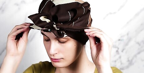 Wrap your head in a scarf or wig cap. Fold a scarf or head wrap into a triangle, place it over your head just past your hairline, cross the ends around the back, and bring them together at the center of your forehead. Tie the ends together so the scarf is snug, but not too tight on your head. Pull any excess fabric down in the back to make sure it’s flat against your head. Remove the clips and replace them over the scarf to secure them. Using a wrap helps minimize frizz or breakage in your hair while maintaining straight hair as it dries. Using duckbill clips or flat clips is preferable to bobby pins, which can leave crimps in your hair.