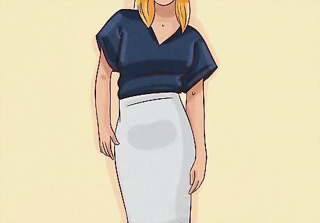 Wear styles that show off your shoulders and legs. While conventional fashion advice is all about balancing your shape, people with an inverted triangle shape have beautiful, strong shoulders and amazing legs. So, show them off! Here are some tips to accentuate and emphasize your natural shape: Wear wide necklines and off-the-shoulder tops. Boatneck, sweetheart, and halter neck tops are great for emphasizing your athletic-looking shoulders. Off-the-shoulder and tube tops put the focus right on them, too. Wear tops with shoulder detailing. To play up your fabulous shoulders and create a dramatic look, wear puff sleeves, tops with shoulder pads, or structured collars. Wear fitted pants that taper toward the ankle. Show off your great legs with jeans and trousers that stay fitted along the thigh and calves. Scherer recommends choosing pants that taper in at the bottom to create an even more slimming effect. Wear fitted skirts and dresses: Pencil skirts and bodycon dresses hug your hips and thighs, which emphasize your slender legs. Plus, they cinch in at the waist, which is super flattering. Maintain good posture: While this technically isn’t a styling tip, having great posture helps highlight your beautiful shape. Plus, it helps you look and feel better. Stand up straight, push your shoulders back and down, and keep your chin parallel to the ground.