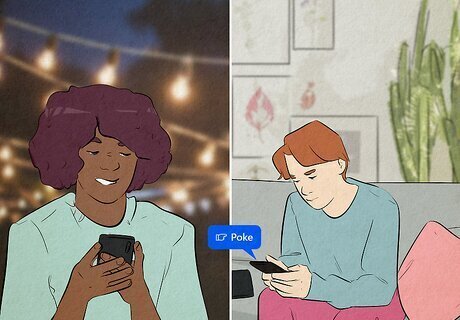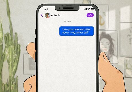 Start a chat with them on Messenger. If poking back feels dumb or not proactive enough, open up Facebook Messenger and start a chat with them. You can do this by going to your main Feed, clicking Messenger, and then “New Message.” Start typing in your friend’s name, and the rest will populate. Feel free to start a conversation using any of the following lines: “I see your poke and raise you a, ‘Hey, what’s up?’” “Miss me much?” “Why poke me online when you can poke me IRL?” “Thanks for the poke! How have you been?”