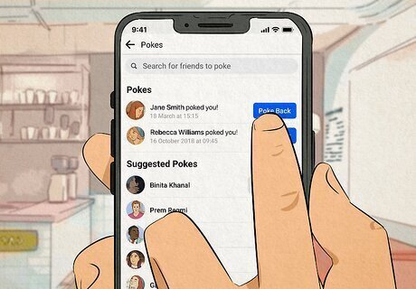 Poke them back. If you’re interested in continuing the interaction, feel free to poke them back by going to their profile and clicking the finger icon below their name. You can also go to the Pokes dashboard by clicking the “Friends” tab, then “See More,” and then tapping “Pokes.” This will show you all your past pokes, allow you to respond to current pokes, and give you access to Friends who could use some poking. If you want to dismiss their poke, go to the Poke dashboard and tap “Friends who poked you.” Then, when you see the friend whose poke you’re trying to reject, click and hold their name, and hit “Dismiss poke.” Remember: if the initial poker is indeed trying to flirt with you, poking them back will likely confirm your interest, so be sure to proceed with caution.