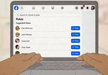 On desktop, go to Facebook.com/pokes. Going to this page will show you all your friends willing to be poked. If you’re looking for a specific person, use the search bar at the top of the page to type in their name. Tap the Poke button next to their name to send them this nostalgic greeting. Another way to do this is to go to your Facebook feed and type in “Pokes” into the search bar in the top left. Click the link that says “Pokes” and you’ll instantly see all your Poke-worthy friends. Poke away!