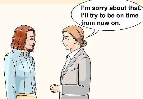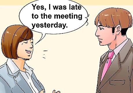 Admit fault. You can use "negative assertions" if the person has a genuine point about your behavior and you want to let them know that you agree with the specific criticism, without allowing the criticism to define you as a person. Admitting fault doesn't have to reflect on you as a person, especially if you recognize the behavior is negative and have a desire to change. Example: If you are frequently late to meetings, you can say yes, I've been late to a lot of meetings recently. I'm sorry about that. I'll try to be on time from now on.