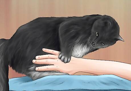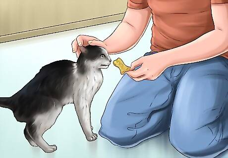 Present an open hand or extend something you're wearing. If the cat approaches you, try to let the cat become acquainted with your smell. Extend your open palm so the cat can smell you and become familiar with you. If the cat shrinks at your hand, you can try extending something you're wearing, such as your glasses.
