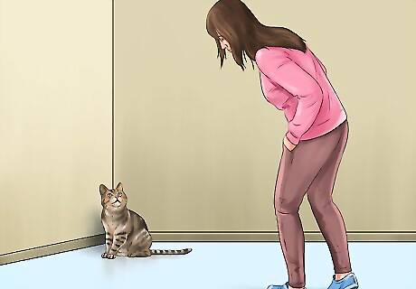 Avoid eye contact with the cat. Direct eye contact can be intimidating for cats or even be interpreted as a sign of aggression. Avoid looking directly at the cat, and instead ignore them when first entering their space.