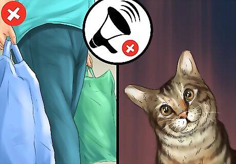 Minimize loud noises. Cats don't enjoy loud or surprising noises. Try to minimize loud sounds when you enter the cat's space for the first time. If you have crinkly shopping or grocery bags with you, for example, leave them outside, so you don't frighten the cat. If you are bringing loud or rambunctious children into the house, ask them to be quiet or take them to another part of the house where they can wait with a trusted adult.