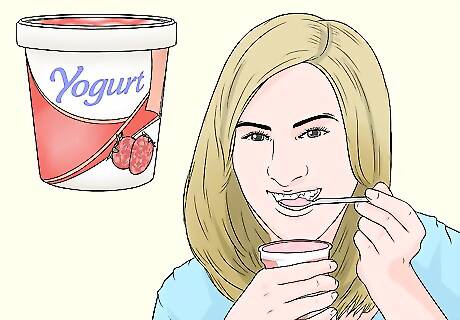 Have yogurt as a snack. Yogurt is a weight-loss staple that also happens to be a significant source of calcium. If you're not a fan of plain yogurt, you can add fruits, nuts, or berries without decreasing the benefits of this food. For example, an eight-ounce serving of fruit yogurt has approximately 345 milligrams of calcium. Just two yogurt snacks during the day would get you more than half of your recommended daily allowance of calcium. Read the food label before you purchase yogurt to review the calories and added sugar content. Some yogurt is more like a dessert as it is full of added sugars. For example, Dannon Caramel Macchiato has 33 grams added sugar. The American Heart Association recommends no more than 24 grams (6 teaspoons) of added sugar per day for women and no more than 36 grams (9 teaspoons) of added sugar per day for men. Add calcium-rich nuts such as almonds to increase the calcium boost you get from yogurt.