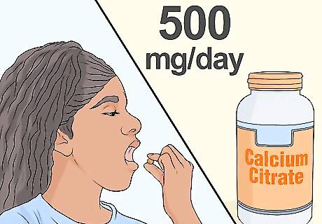 Take the correct dosage. You want to take no more than 500 milligrams of calcium at a time, since your body can only absorb a limited amount. Take your calcium supplements with food once or twice a day. There may be instructions on the label regarding the maximum amounts for people of different age groups. Follow these instructions carefully and don't take any more calcium than what is recommended for people your age. If your doctor tells you to take a different dosage than what is recommended on the bottle, follow your doctor's instructions. Taking your calcium supplement with food not only increases the amount of calcium your body absorbs, but also may decrease side effects such as indigestion or heartburn.