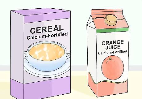 Have calcium-fortified cereal and orange juice for breakfast. There are many companies that add calcium to breakfast cereals and orange juice, so this can be an easy way to add calcium into your weight loss diet first thing in the morning. Check the nutrition labels to verify how much calcium is included in a single serving. You also can find out fat and calorie information there so you can figure out how to incorporate calcium-fortified foods and drinks into your weight-loss diet. Check the nutrition information for the amount of sugar in the cereal as well. Try to find one that has a single digit amount.