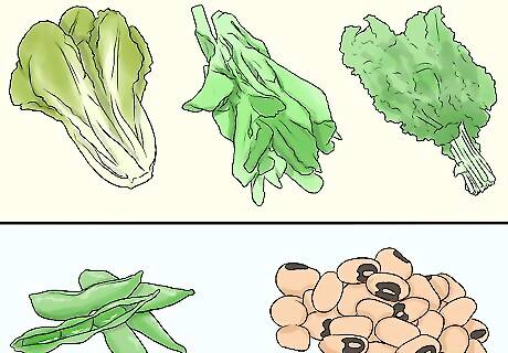 Include plenty of leafy greens and beans or legumes at lunch and dinner. Dark greens such as romaine hearts, kale, and mustard greens are particularly rich in calcium. Beans and legumes such as edamame and black-eyed peas also add a boost of calcium to your meals. Flavoring your vegetables with oregano, garlic, basil, or thyme will increase the calcium you get from these foods. Collard greens, broccoli, and turnip greens go well in a soup, casserole, or stir fry. Beans and legumes also work well here, or can be added to chili along with a light protein such as chicken or turkey. If you're having a salad for lunch, include dark leafy greens such as arugula, romaine hearts, or red leaf lettuce to add calcium. A light dressing with dill or basil will increase the calcium.