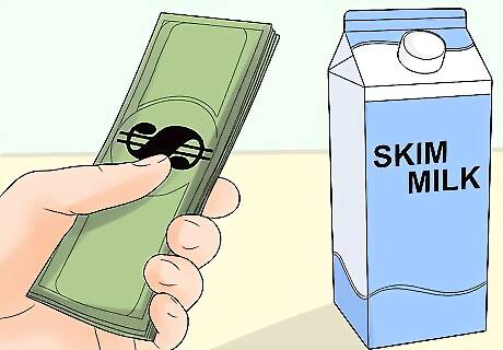 Buy low-fat or skim milk. A pint (about 2 cups) of skim milk only has 190 calories, and a higher calcium content than full-fat milk. Skim milk has 25 mg more calcium than whole milk. If you drink just three glasses of skim milk each day (one with each meal), you'll be well on your way to getting the calcium you need. If you're between 19 and 50 years old, you need at least 1,000 milligrams of calcium a day. Add 200 more milligrams per day if you're over the age of 50. Since there are around 300 milligrams of calcium in 8 ounces of skim milk, three 8-ounce glasses a day will provide you with 900 of the 1,000 milligrams of calcium you need. If you include low-fat dairy in your weight-loss diet, not only will you get plenty of calcium, but you may lose weight more quickly than you would if you left milk and other dairy products out of your diet. If you're lactose intolerant or don't consume dairy products, look for non-dairy milks such as soy milk or orange juice that are fortified with calcium.
