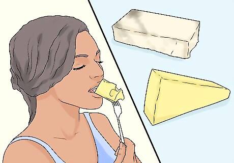 Eat mature cheeses. If you're on a diet, you probably think cheese is off limits. However, mature cheeses such as aged cheddar and parmesan are not only good sources of calcium, they can actually help you lose weight. Just make sure that you watch your serving sizes. A serving of cheese is 1 to 1 ½ ounces. These cheeses can help you lose weight thanks to high amounts of the chemical butyrate, which essentially revs up your metabolism. Aged cheeses such as Parmesan and Swiss also may be okay for you even if you're lactose intolerant, since they contain very little lactose. These cheeses are easy to add to your weight-loss diet. For example, you might sprinkle some grated parmesan cheese onto a salad of leafy greens.