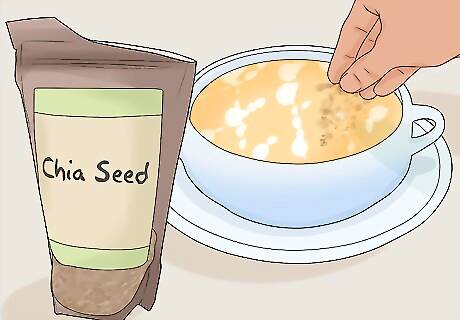 Sprinkle chia seeds on yogurts or cereals. Chia seeds are a good source of calcium and several other nutrients that are important for strong and healthy bones, such as phosphorus and magnesium. A one ounce (28 grams) serving of chia seeds provides 18% of the RDA of calcium. Because chia seeds have a relatively bland flavor on their own, they are easy to incorporate into your diet, such as by sprinkling them on your cereal, yogurt, salad, vegetables, or rice. Chia seeds also may lower your risk of heart disease and Type 2 diabetes. If you're overweight, you already are at increased risk of developing these diseases, so chia seeds are perfect to mix into your weight-loss diet. If you want to add chia seeds to your diet, include about 1.5 tablespoons with two meals. For example, you might sprinkle chia seeds on your oatmeal for breakfast, then add them to your salad at lunch.