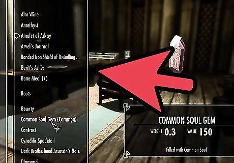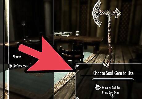 Select a Soul Gem. Scroll down to “Soul Gem” and choose the one you would like to use. Remember, the bigger the soul, the more magical abilities or stronger your weapon will be.