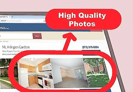 Feature high-definition photographs. Include photos in every posting method that allows for them. Take care to choose an especially attractive photo for listing methods that will include a thumbnail photo, as this is likely what people will look at when scrolling through a list of listings. Post multiple photos if you're able, featuring every room and feature of the unit. If the posting method does not allow for multiple photos, include a link to another website, such as a facebook page or imgur album, that will allow a viewer to see me of the unit.
