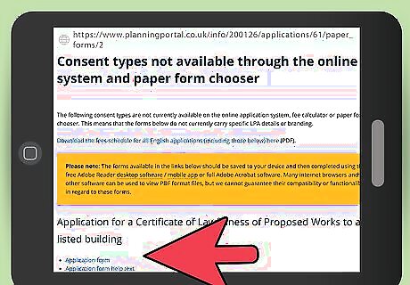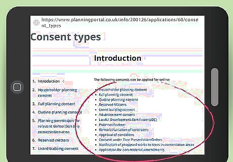 Apply online for the appropriate consent types. You will need to know, from your preliminary research, which additional consents you need. If you have questions, the web site can help guide you. You should also contact your local planning authority if you need further guidance. The following is a list of the consent types that you can apply for online: Householder planning consent Full planning consent Outline planning consent Reserved Matters Listed building consent Advertisement consent Lawful Development Certificate (LDC) Prior notification Removal/variation of conditions Approval of conditions Consent under Tree Preservation Orders Notification of proposed works to trees in conservation areas Application for non-material amendments