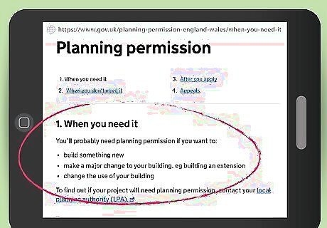 Determine whether you need planning permission. In general, you will need planning permission if you are going to build a new structure, make changes to an existing structure, or change the use of a current building. If your plans fall into one of these three major categories, then you will probably need to obtain planning permission before you continue. For most projects throughout the United Kingdom, you can find the information you need at PlanningPortal.co.uk.