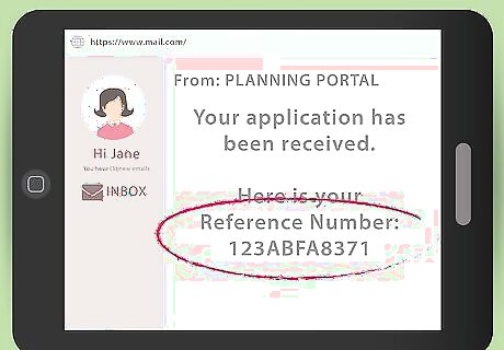 Receive confirmation of your application. After your application is submitted, you should soon receive an email from the Planning Portal. This email is not approval of your project. It is confirmation that your application has been received. As part of the confirmation, you will receive a unique reference number. Make note of this number and continue to use it on all future correspondence with the authority.
