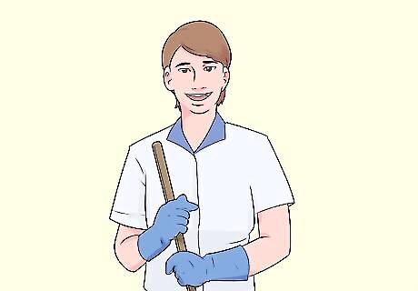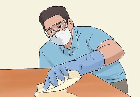 Learn to use proper personal protective equipment (PPE). Although some schools might be lax on safety standards for custodial staff, this does not mean you shouldn't be practicing it. Even if other custodians aren't using it, doesn't mean you shouldn't!. Commercial cleaning chemicals are not friendly to your eyes and skin so you need to protect them appropriately. PPE should be supplied by your district, so ask your supervisor where it is. Wear appropriately sized gloves when working with any chemicals that may touch your hands, such as when wiping surfaces or using a sponge. Also use gloves when you are handling trash, especially trash containing food waste or from the restroom. Wear goggles when working with chemicals and the risk of splashing occurs, such as when mopping, cleaning sinks and urinals, and using mist spraying. Wear a mouth mask when toxic vapors or dust is present, such as when stripping, finishing, or burnishing a floor, or using chemicals in a room with little ventilation.