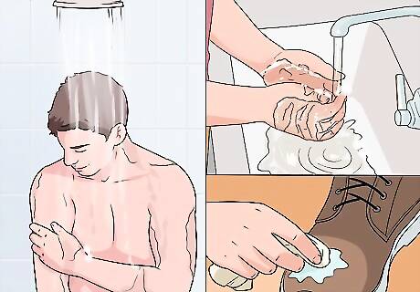 Practice good hygiene. You should be cleaner than the building itself so that you avoid bringing more germs and dirt into it than you take out. Take it upon yourself to avoid creating more mess than you clean up. Wash your hands every time you take a break or meal. Shower daily to remove dust, chemical residue, and germs. Keep your shoes clean so you don't track mud into the school. You'll just be creating more work for yourself or coworkers. Use a clean rag every time you switch activities and change mop water after every room you mop. At the end of your shift, put your tools and chemicals in storage. Don't leave dirty rags or buckets of water sitting around, deal with them before you go home. No one wants a bad whiff of something coming from the custodial closet. Keep your own work area clean, whether this is your closet where you keep supplies and carts or your cart itself. Don't leave trash sitting, take it to the dumpster.