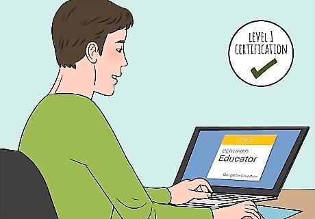 Start out by getting a Level 1 certification. If you're unfamiliar with Google products or would like an introduction for using Google in your classroom, choose level 1 certification. This level can help you learn how to save time using technology, ways to streamline communication, how to use videos in the classroom, and how to teach your students online skills. Once you have the skills from level 1, you might want to learn even more tools to use in your classroom. Take level 2 to develop interactive courses, teach research skills, and set up online classrooms. You don't have to complete level 1 before getting your level 2 certification.