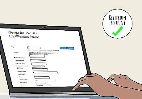 Create a Kryterion account. Once you're confident that you know the exam material, visit Google's teacher center and click "Exam Details" or "Register for the Level 1 (or 2) Exam." It will direct you to enter personal information for a Kryterion account. You'll need to provide: Name Address and email address Your relationship with Google Your school or employer