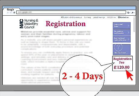 Register with the Nursing & Midwifery Council (NMC). After you've finished your program, your university will automatically send the NMC your basic information and the course details. You'll be notified about a week after the NMC confirms this information. Once you've received confirmation, you can then pay the registration fee of £120 and declare any criminal cautions or convictions. After the NMC approves your application, you should be on the register within 2 to 10 days. If you wait more than 6 months after completing your program to register with the NMC, you'll need to fill out a separate application to the NMC.