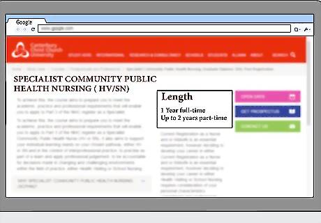 Enroll in a Specialist Community Public Health Nurse (HV/SN) program. As soon as you've registered as a nurse or midwife, you can enroll in the program to become a health visitor. An SCPHN/HV program typically lasts one year if you take full-time classes. You can also take part-time courses, although it will take you longer to complete. Many part-time programs allow you to complete the degree program in two years instead of one.