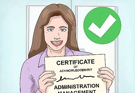 Earn key certifications to increase your management proficiency. Not all positions will require certification, but having a certificate in administration shows that you have specific knowledge and proficiency in management. You may also consider taking a certificate in finance or informatics. Certain fields of administration may have specific certificates that are recommended or required. For example, healthcare administrators can take certificates in healthcare administration or even healthcare finance.