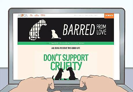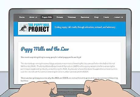 Familiarize yourself with state and local laws. In the US, the Animal Welfare Act includes standards for commercial dog breeding, but it isn't effectively enforced and still allows puppy mills to exist legally. Over half of US states have laws that regulate commercial dog breeders. Find out whether your state has any such laws by searching the internet or by using the ASPCA’s in depth guidelines on state laws. If you live outside the US, contact your country’s human society SPCA for information about your local legislation.
