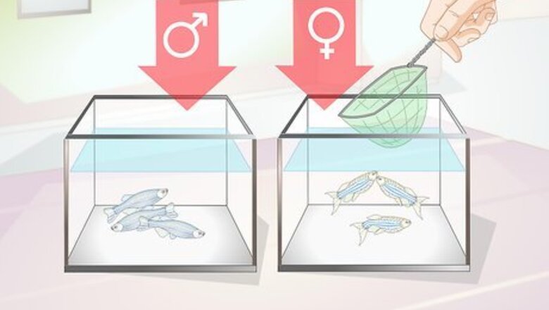 Separate male and female danios. Start the breeding process by making sure you can tell the difference between your male and female danios. Male danios are normally skinnier than their female counterparts, and their colours are usually more vibrant. If the females have started to produce roe (eggs), they’ll look chubbier. Once you’ve sexed your danios, place the males and females into separate tanks to prepare them for breeding. If you’re having a hard time sexing your danios before they’ve been conditioned, you may need to feed them premium live food for a couple of days before you’ll be able to tell them apart. Once you can tell them apart, separate the males from the females.