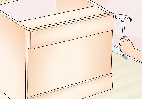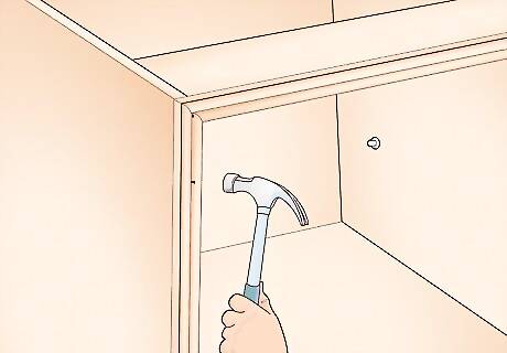 Attach the optional face frame to the front of the cabinet. With the front of your cabinet facing up, squeeze wood glue onto the top sides of your cabinet to provide a little hold. Press the face frame onto it so the frame is even with the sides of the cabinet. Then, hammer in finish nails or use a nail gun to nail the face frame to the cabinet. To give the frame a polished look, you can fill the nail holes with wood putty. Finish nails are slightly wider than standard brad nails. They're sturdier so they'll give the frame more stability.