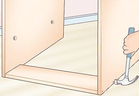 Tack both side pieces to the bottom piece using nails or wood staples. Set 1 of your side pieces up on your work table and push the back edge of the bottom piece next to it so they form a 90-degree angle. Use a wood stapler or hammer in nails to temporarily tack the pieces together. Then, repeat this with the other side piece. You can also ask a friend to help you keep the pieces in place as you tack them. To stop the cabinet box from moving while you assemble it, clamp a block of wood to your work table. You can push the cabinet frame against it to prevent it from sliding while you work.