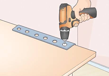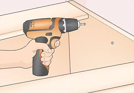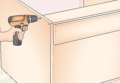 Drill screws into the sides of the cabinet to secure the pieces together. Use a drill to pre-drill holes along the sides of your cabinet where pieces meet. Drill at least 1 hole about 1 inch (2.5 cm) from the end of each piece. Then, go back and drill 1 ⁄8 in (4.1 cm) wood screws into the holes you made. Plan on drilling 2 screws onto the side of each brace and 5 screws along each side of the bottom piece.