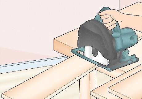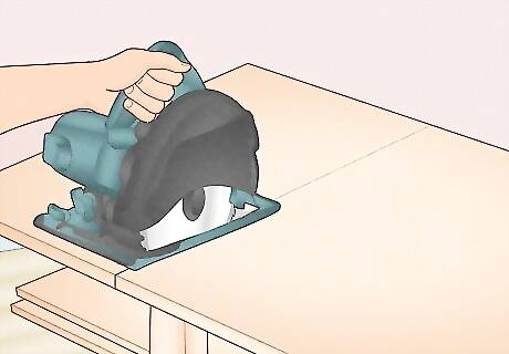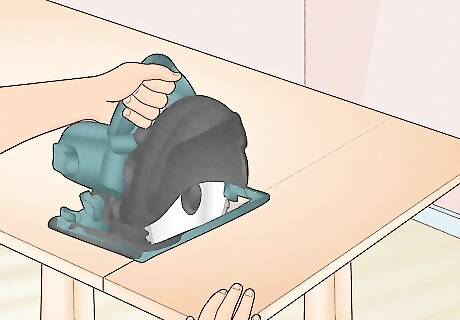 Cut 2 side panels and 1 bottom panel from plywood. Lay a sheet of ⁄4 in (1.9 cm) thick plywood flat on your work table. Run it through a table saw or use a hand saw to create 2 evenly sized pieces for the sides of your cabinet. Then, cut 1 bottom panel that's equal to the width you want for the whole cabinet, minus 1 ⁄2 inches (3.8 cm) for the combined widths of the 2 side panels. For instance, if you want the kitchen cabinet to be 24 inches (61 cm) wide, subtract 1 ⁄2 inches (3.8 cm) for the side panels. Your bottom panel piece will be 22 ⁄2 inches (57 cm) wide. You can make the side panels as high as you'd like your cabinet—anywhere from 30 to 36 inches (76 to 91 cm) is common. You can use solid wood if you prefer sturdier cabinets. However, manufactured wood is inexpensive and easy to work with. You might see cabinet instructions using medium-density fiberboard (MDF), but this isn't as strong as plywood so it may not be a good choice if you're looking to build strong kitchen cabinets.