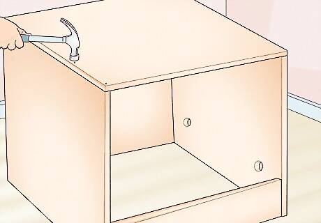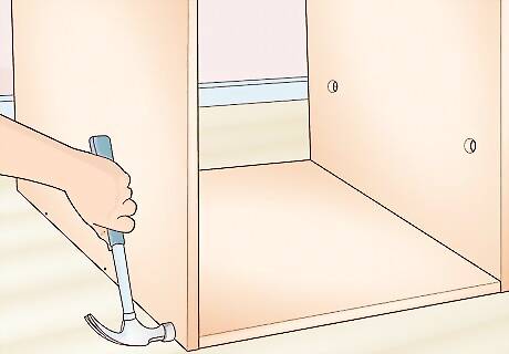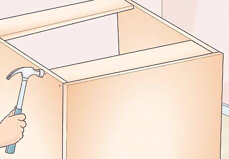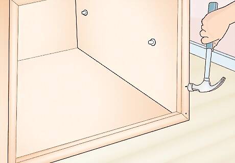 Nail the back panel to the back of your cabinet. Flip the cabinet over so the front faces down on a flat surface. Then, place the back panel plywood piece on the cabinet so the edges line up perfectly. Nail the back piece to the edges of the cabinet to secure them. If you've got a nail gun, you can quickly attach the back piece to the cabinet. Line up the nail gun so the nails go directly into the wood and not into the empty space of the cabinet.