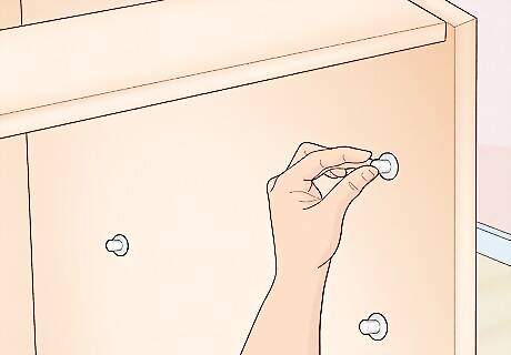 Use pegs or corner brackets to support the shelves. You can either push pegs into the holes you drilled on the side of the cabinet and place a shelf directly onto the pegs, or you can put the shelf in place and screw in a corner bracket directly underneath the shelf. Repeat this for the opposite side of the shelf. You can install purchased shelves or make your own by cutting a piece of plywood to the width of the cabinet bottom.