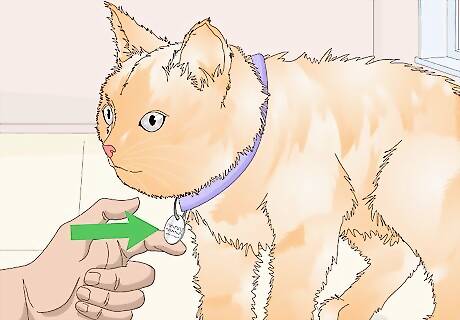 Purchase a collar and tags. It is important for you to put a collar and tags on your cat as soon as you get it. This will assure that if your cat gets lost anyone that finds it will be able to return it to you. Make sure the collar is the right size for your cat. It should be snug but not so tight that is restricts the cat's breathing or swallowing. Select a collar that has a quick-release catch, an important safety feature. If your cat is ever caught by the collar, this important release allows the cat to safely escape without harm. Avoid collars with elastic portions, which may be stretchy enough for a cat to get its leg through and become trapped. The information on your cat's tags should include your name, address, and a telephone number.