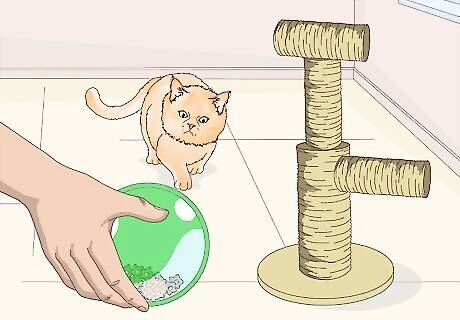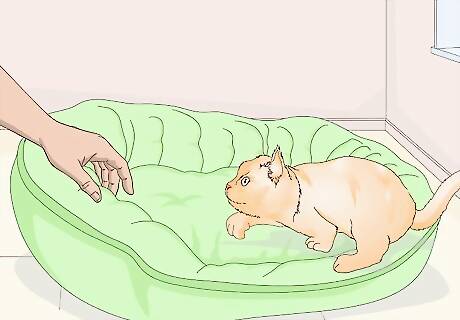 Get the cat a bed. In order to make your new cat feel at home, give it a soft and welcoming spot of its own. The cat bed you buy could be very simple or it could be relatively fancy, such as a heated cat bed that plugs into an outlet. Of course, you cannot guarantee that the cat will love the bed that you buy for it right away. In many cases, it will choose a pillow or an area on the carpet over the bed you chose for it. Don't be dismayed. You may just need to lure the cat towards the bed with a few toys, some cat nip, or by placing the bed in a warm and sunny spot.