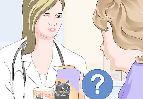 Discuss food options with your veterinarian. If you are unsure what brand and type of food to feed your new cat, talk to your veterinarian for suggestions. Your veterinarian should be able to give you some ideas that will fulfill the nutritional needs of your cat. A good time to ask about food recommendations is when you bring your cat in for a checkup as soon as you get it. Your veterinarian may suggest a specialty food for your cat's specific needs. This may include kitten food, senior food, or food for cats that need to lose weight.