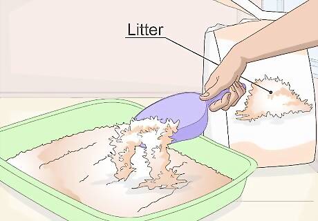 Buy a litter box and litter. Even if you plan to allow your cat outside part of the time, you will still need to provide a litter box and litter for it. Find a place to put the litter box where the cat will have easy access to it. Just as with the cat's food, it's best to begin by using the same litter that the cat has already been using. This will reduce the risk of the cat choosing somewhere other than the litter box to go to the bathroom. Choose the largest litter tray you have space for, and ask the cat rescue or previous owner whether the cat is accustomed to an open or covered box. If your cat is reluctant to use its litter box it could be due to the type of box or the type of litter. Make sure that the cat can get in and out of the litter box easily. You can also try using a different type of litter.