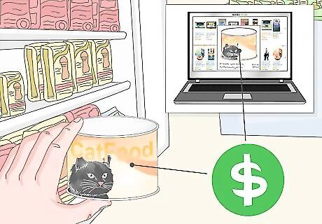 Compare prices. Once you pick a brand and type of cat food, compare prices at your local stores and online. The same exact product may be a very different price at different stores. Remember that if you order cat food online you may need to pay for shipping as well. You can also reduce the cost of cat food by buying in larger quantities. You will get the food cheaper if you buy large packages than you would if you buy small packages.